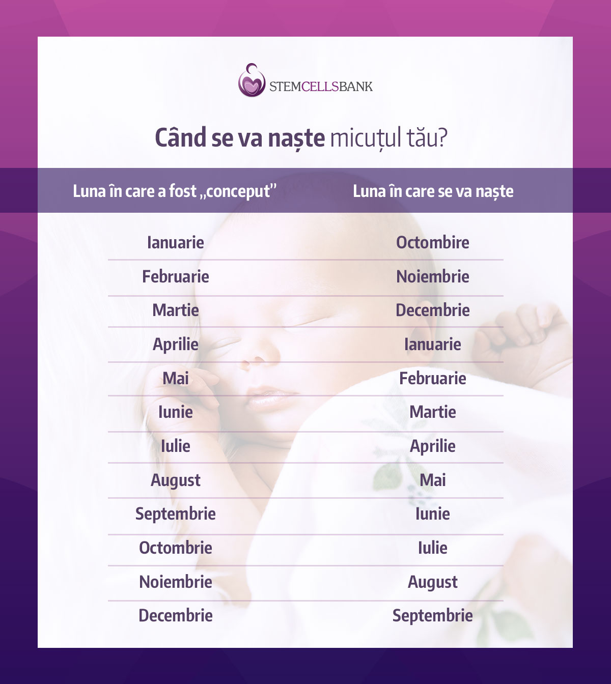Chiar dacă nu poți să știi exact când se va naște micuțul tău, am pregătit pentru tine un tabel cu luna aproximativă în care se va naște micuțul tău, în funcție de luna în care a fost „conceput”.